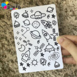 - Gia công: Bắt buộc phải Cán Màng (chọn màng mờ để chống bám vân tay và sang trọng) và Bế Demi theo hình dáng của từng sticker (hành tinh, phi hành gia…).