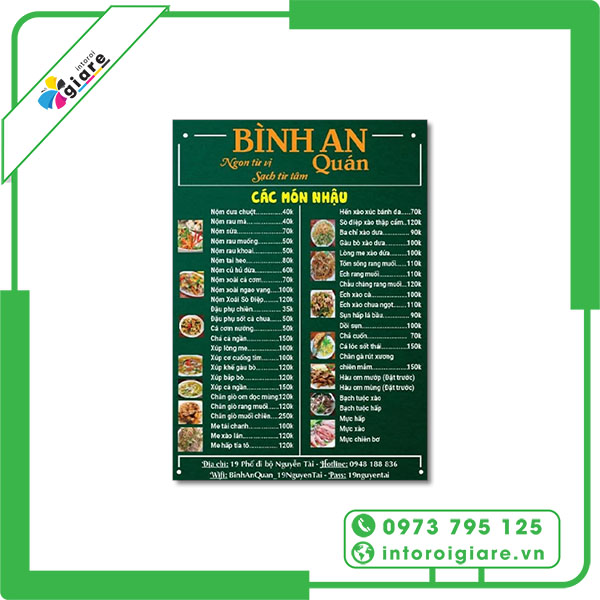 Đừng để những tấm thực đơn cũ kỹ, nhàu nát làm mất điểm trong mắt thực khách. Hãy liên hệ ngay với Intoroigiare.vn để được tư vấn và sở hữu những mẫu menu quán nhậu đẹp, độc đáo và chất lượng nhất. Chúng tôi luôn sẵn sàng hỗ trợ bạn tạo nên sự khác biệt!